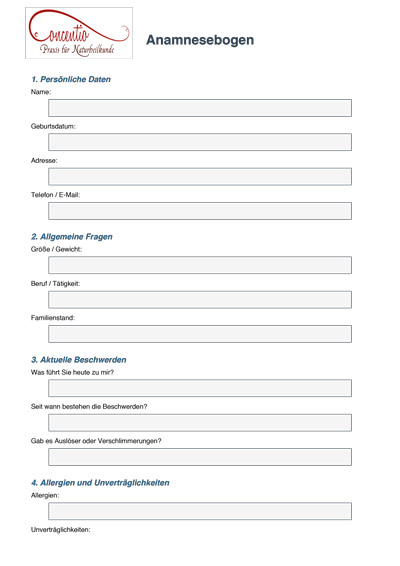 Dieses Formular dient als Grundlage für unser erstes Gespräch. Sie können es sich in Ruhe zu Hause ausdrucken und ausfüllen. So sparen wir wertvolle Zeit in der Praxis, die wir dann ganz Ihrem Anliegen widmen können.